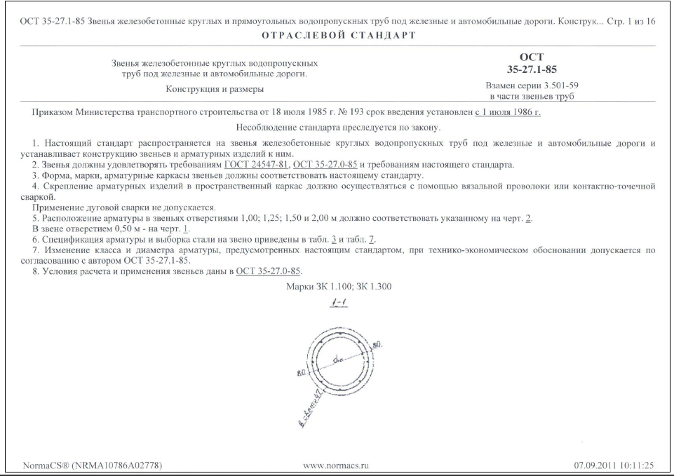 ОСТ 35-27.1-85. Звенья железобетонные круглых и прямоугольных водопропускных труб под железные и автомобильные дороги